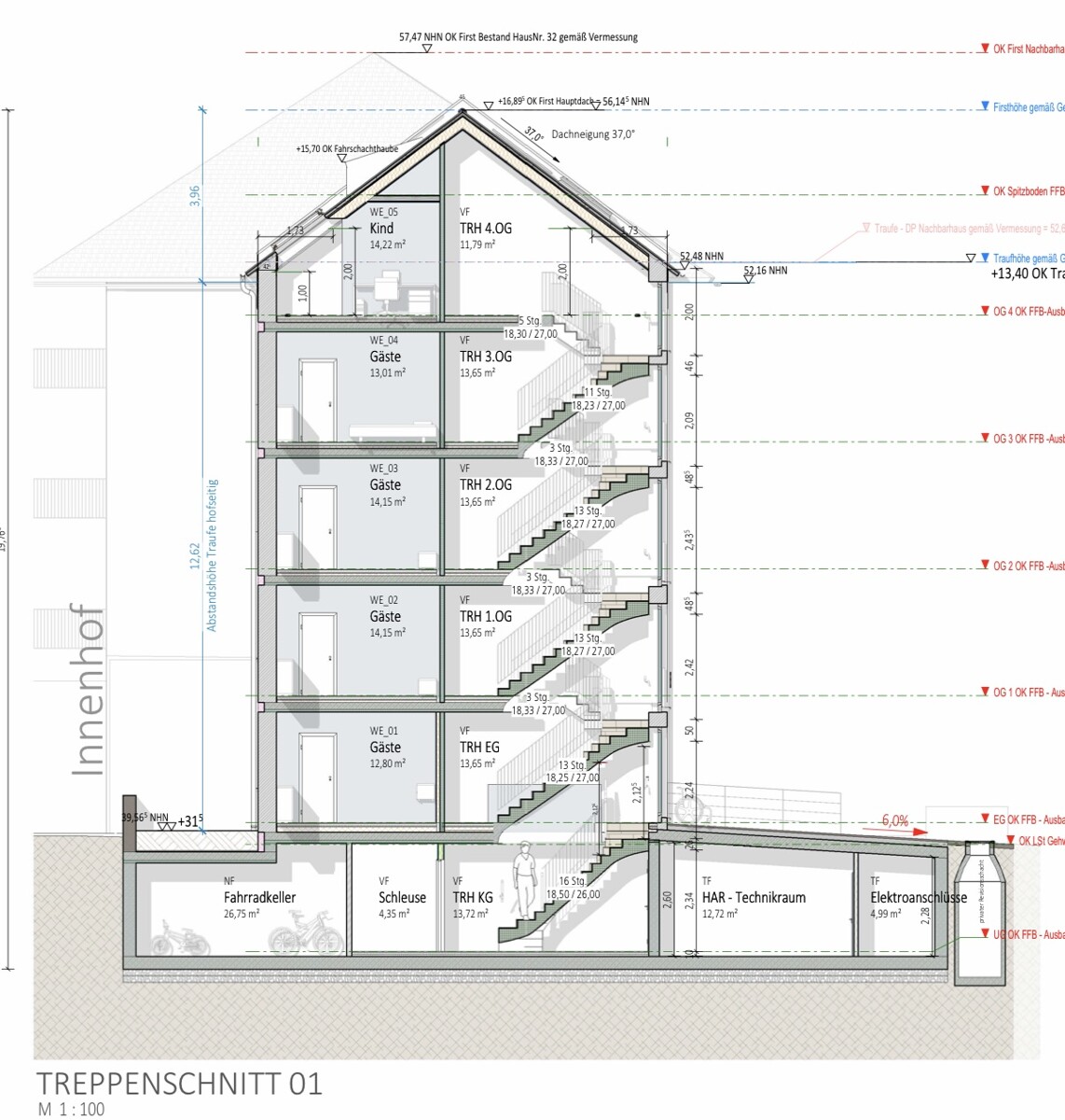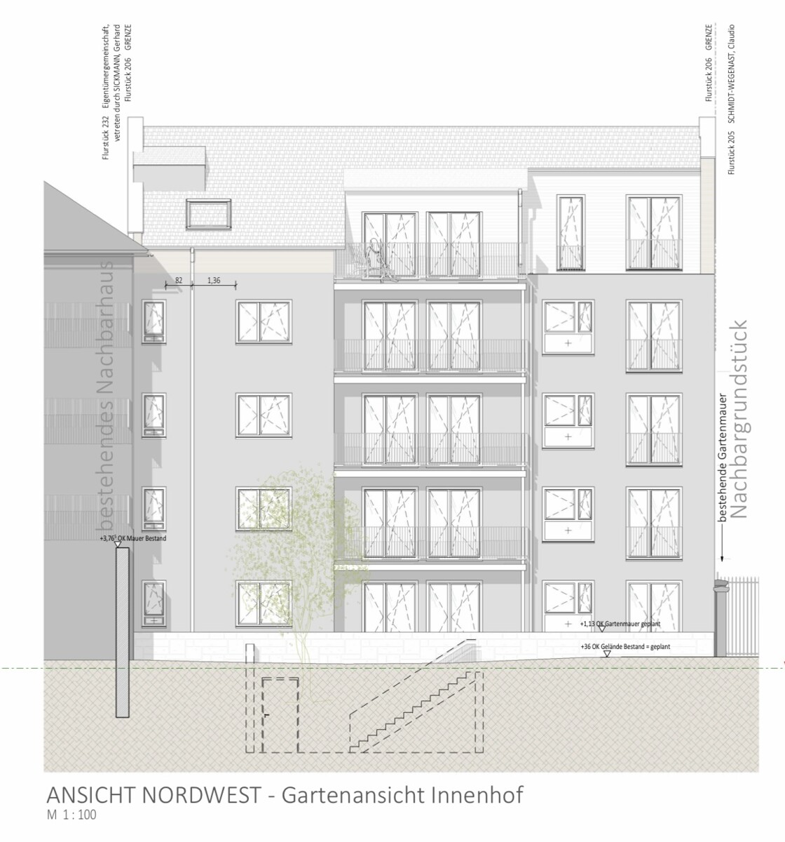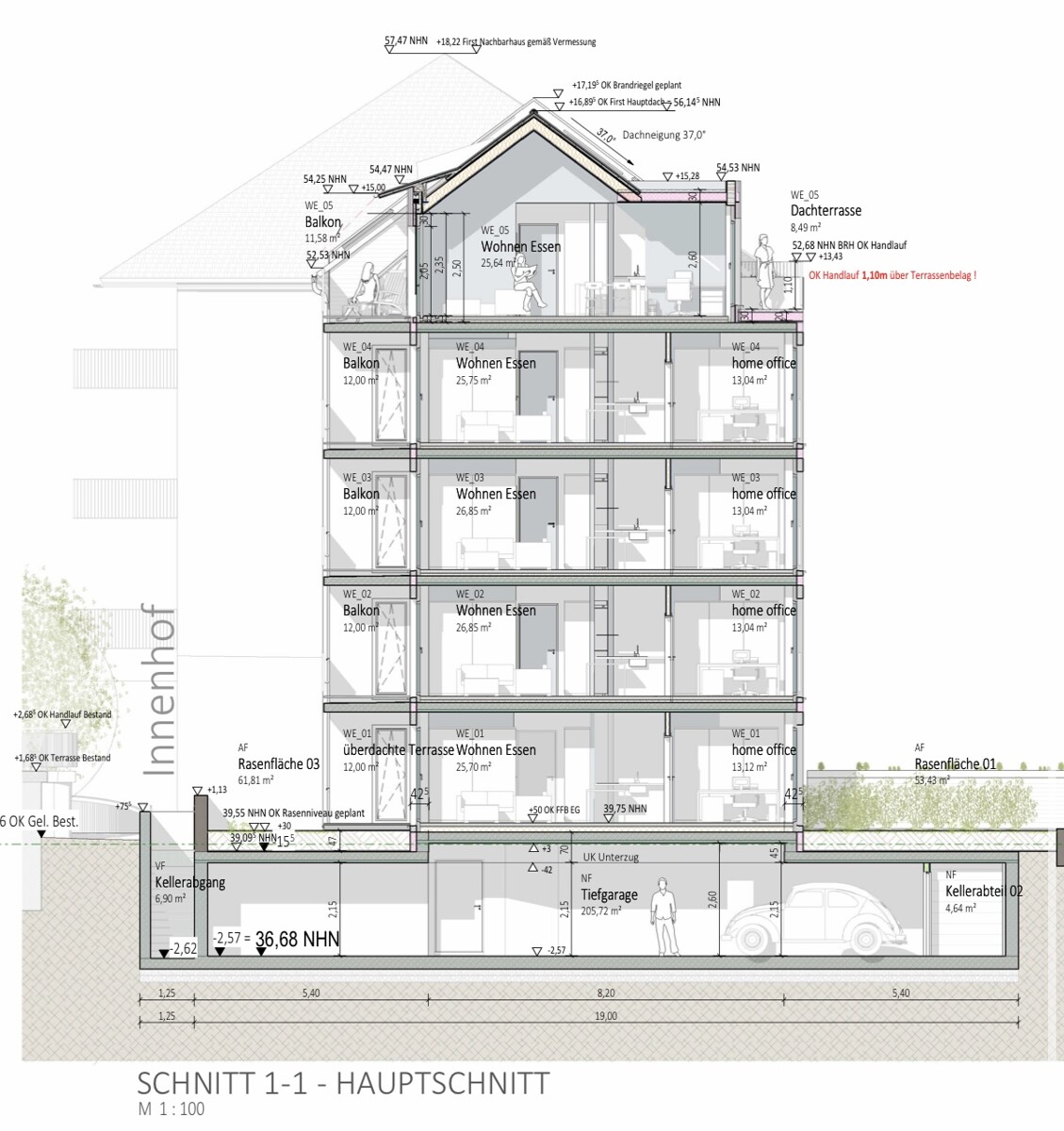 Gesamt ergeben sich somit 1.031,25 qm Wohnfläche aus genehmigtem Neubau und der Villa im Bestand, welche ebenso in 5 ETW’s umgebaut werden kann.